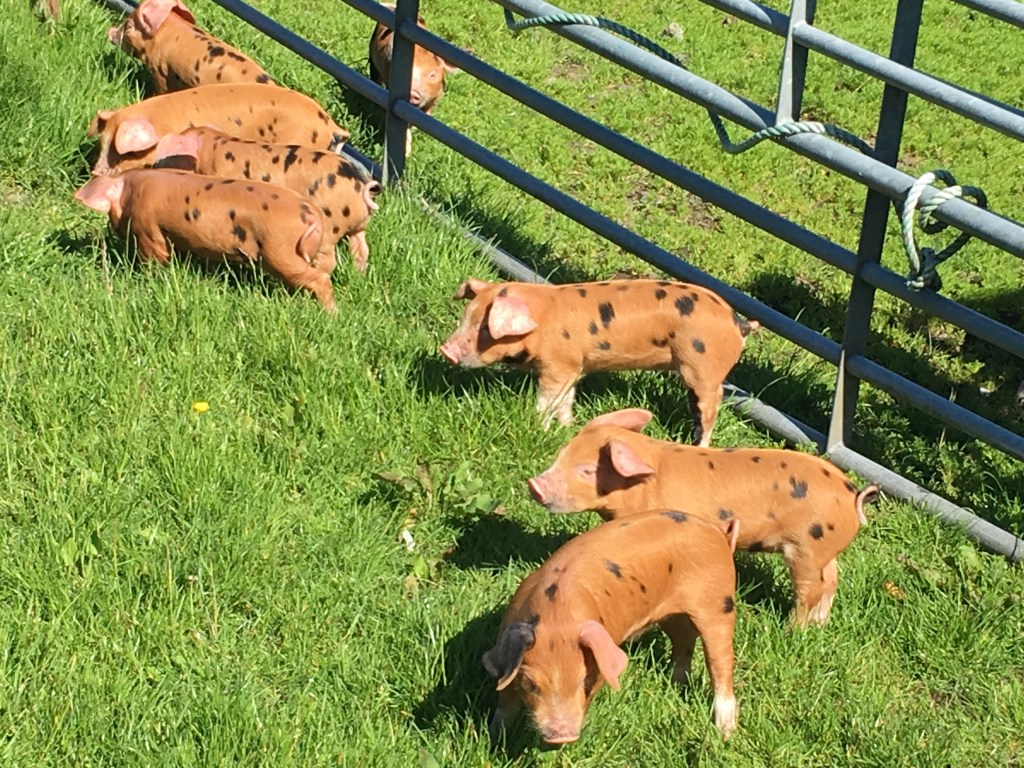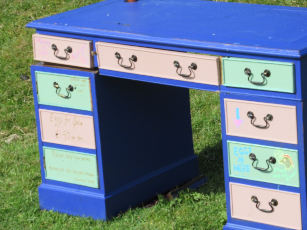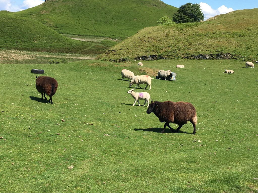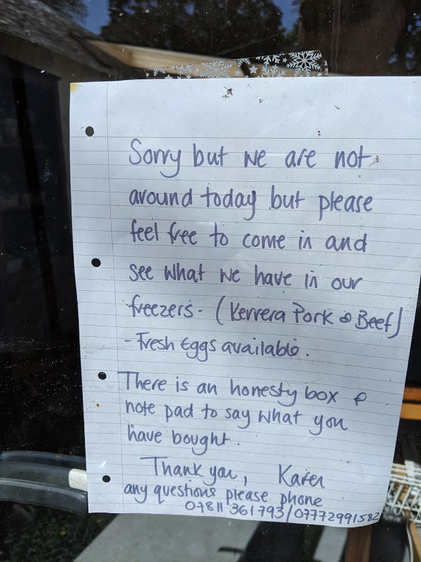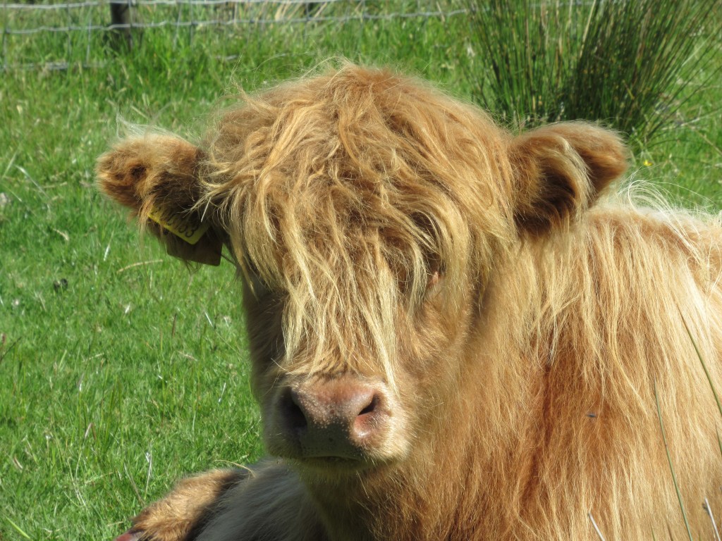 We soon learned that, while Kerrera has a small population of people, it has a substantial population of sheep, Highland cattle, and rabbits.  Our morning was spent walking along dirt and gravel roads, enjoying the scenery to the sound of bleating sheep with their spring lambs.  A black dog took up with us for a while and led the way, then was distracted by something and left. There were a number of fences and gates across the road along the way – none were locked, but most had signs asking that the gates be closed and latched. We found a charming old dresser in a yard that served as a self-serve vending station for fresh eggs.  Later on, we came across a farm store with note on the door from the proprietor that she was away for the day, but the door was open and anyone who wished could enter and make a purchase. This level of trust in visitors to the island on the part of the residents was refreshing and seemed to be fairly common. The small farm store – not much larger than a walk-in closet – sold bottled drinks, cheese, meat, eggs (both duck and chicken), and other items.  We chose a bottle of Victorian Lemonade from the small refrigerator, wrote our names and our purchase in her notebook, opened her cash box, and paid the £1.50 for the drink.  Back outside, we sat on wooden crates in the sun and passed the lemonade back and forth until it was gone. It was cold, tart, slightly carbonated, and very refreshing.  Leaving the farm, we came across a pig sty with a litter of little piglets. To our surprise, they had no trouble getting out of their pen, and mama pig didn’t even seem to notice their exit. They ran around our feet thinking that maybe we were there to feed them.