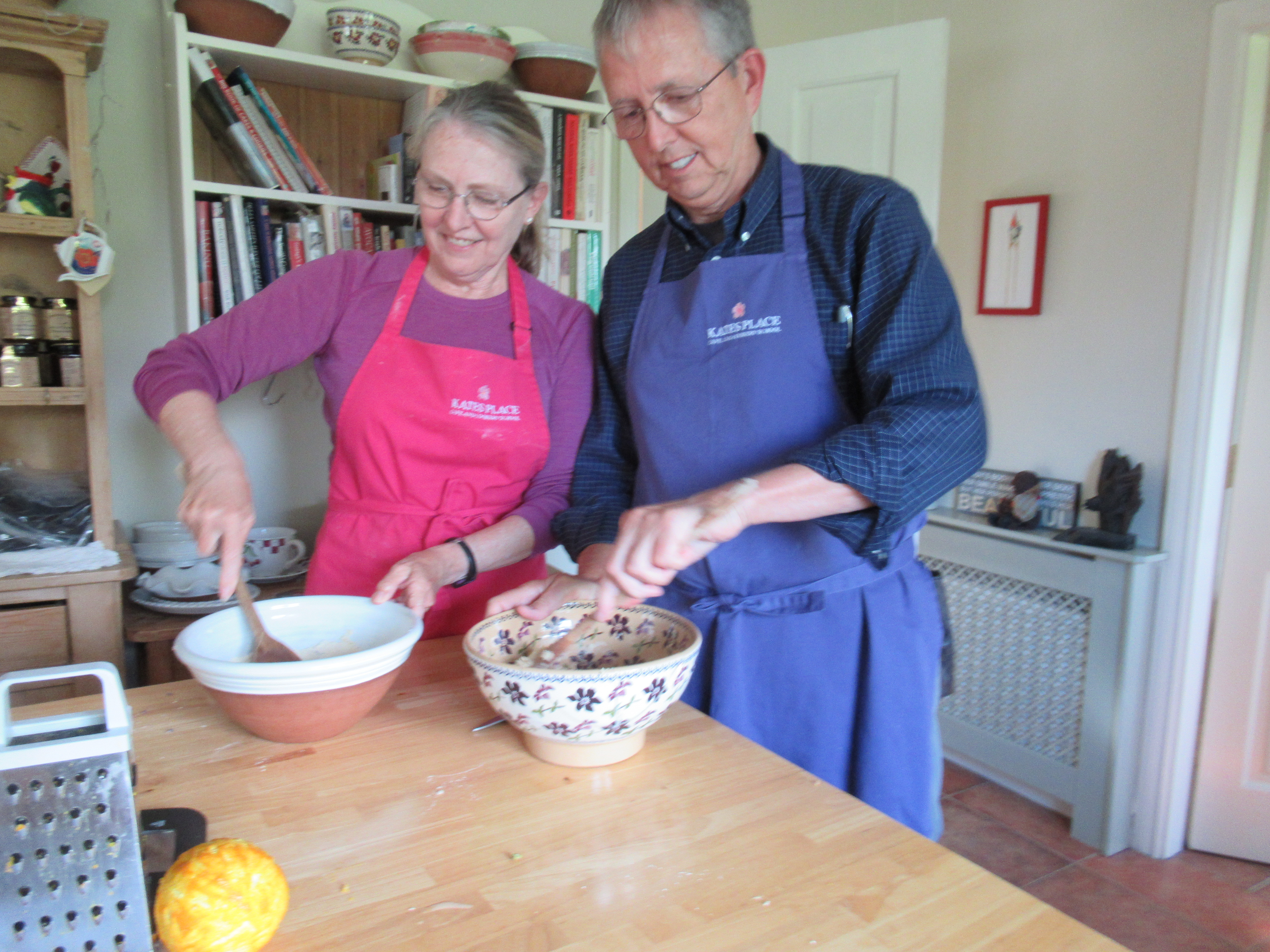 John opted to make orange and cranberry scones; I chose the lavender. The secret to making light and fluffy scones, we learned, starts with mixing the butter in with the (self-rising) flour. The butter was very soft, but not melted – about as soft as it would be if you left it out for several hours. Butter was mixed with the fingers, both hands, very thoroughly, being careful to sort of “fluff” the mixture to ensure lightness. Wet ingredients followed (see recipe at the end of the blog) and then the dough was ready for light kneading. The kneading and cutting was the exact same technique I have used to make biscuits for all these years. After cutting and brushing with an egg wash, the scones were ready to go into the oven. Next we started on the brown bread. Kate helped us in the process, occasionally throwing an ingredient in that she deemed, from experience, to be the right amount of something. We popped the batter into small pans and sat down with Kate in the kitchen to wait.