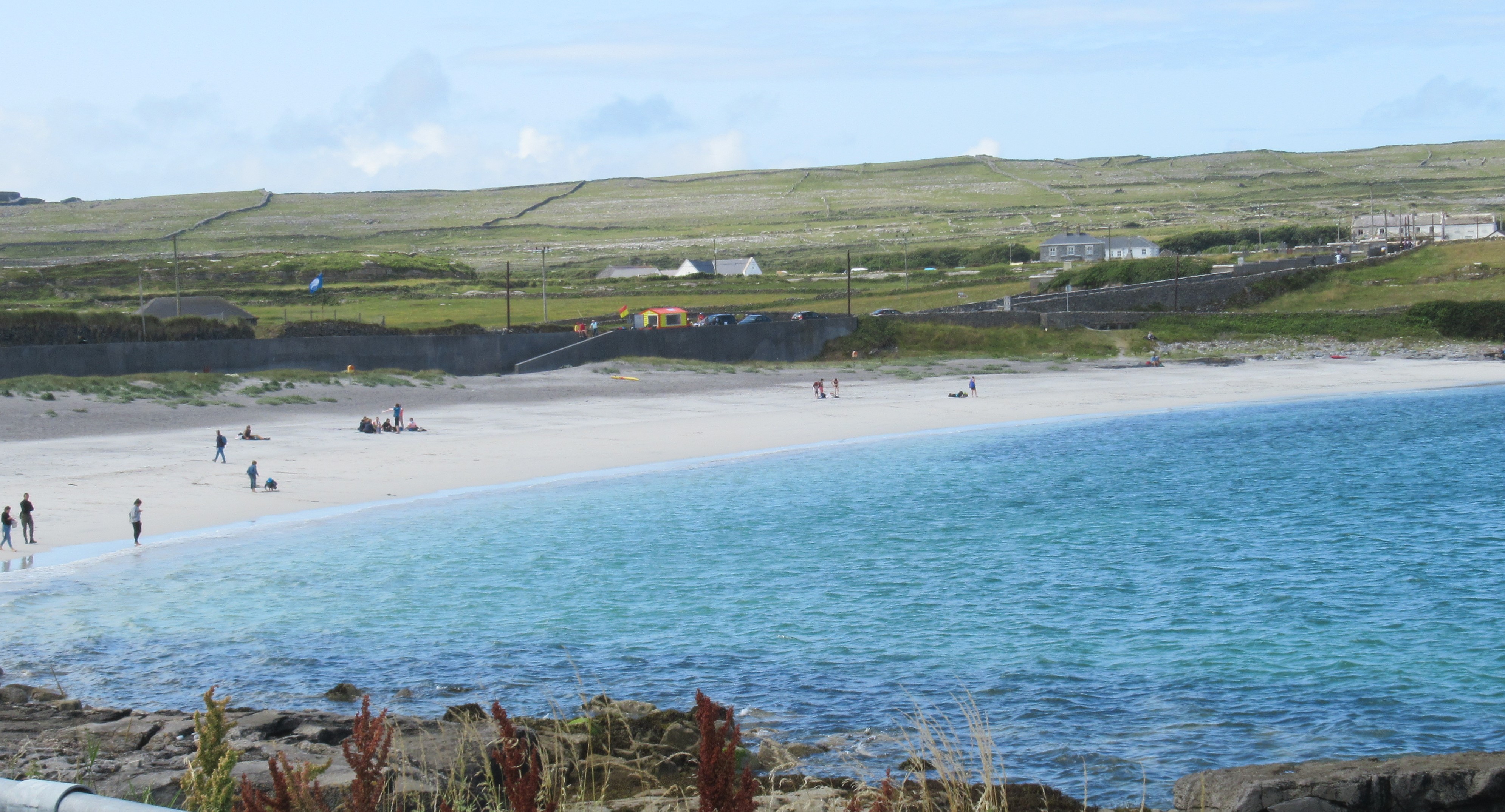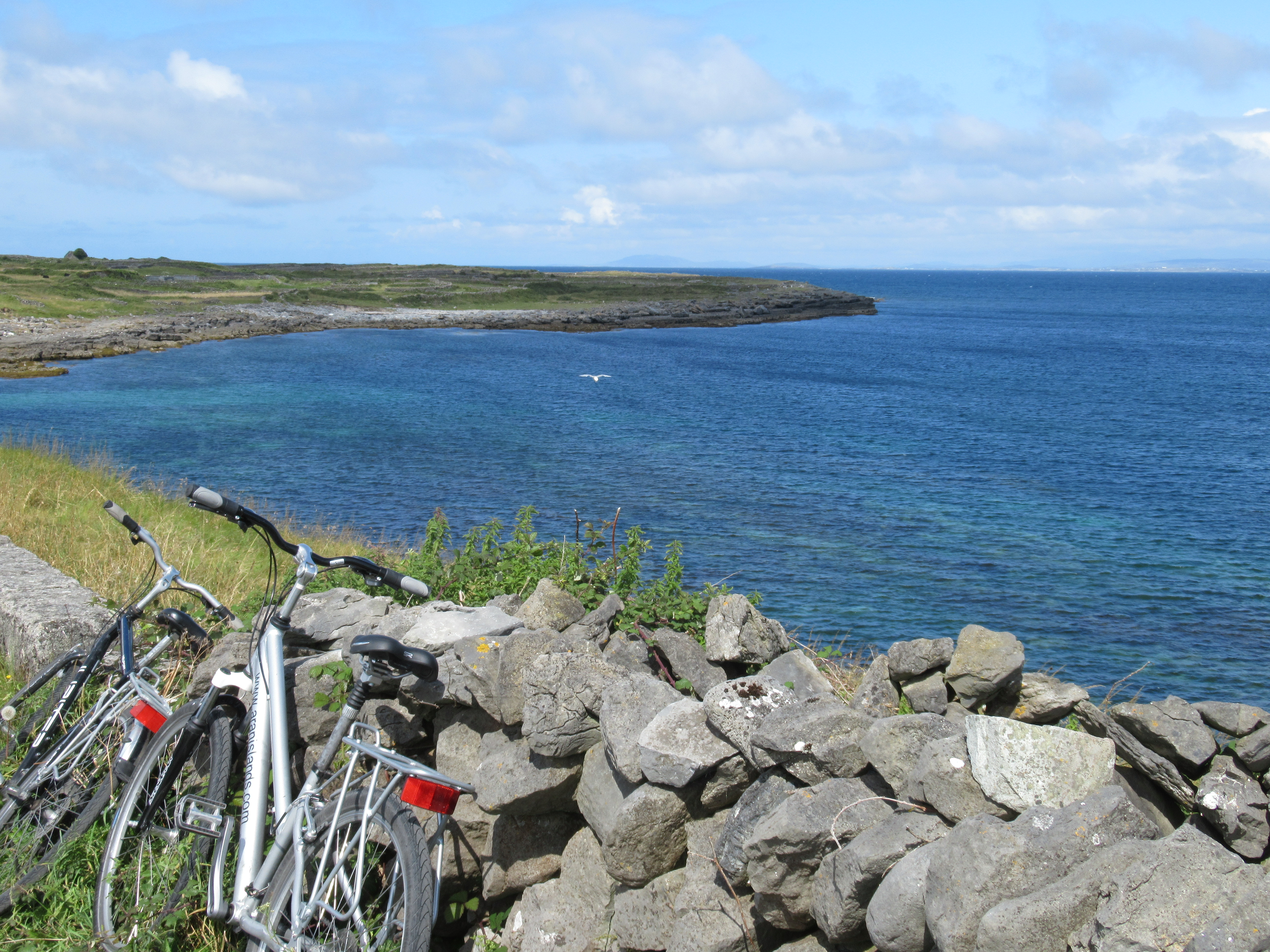 The next morning we headed off to Inishmore or Inis Mor in Gaelic, the largest of the Aran Islands. The trip involved a bus ride of about an hour to Ros a Mhil Harbor, then another hour on the ferry to the village of Kilronan. I had visited Inishmore sixteen years ago with Mary and Chris, my two youngest children, when they were 13 and 10 respectively. We were there on a cool, overcast, and blustery day in early June. We rented bikes and, after we got beyond Kilronan, we scarcely saw another human all day. We visited a sandy beach, some ruins of a church, and had a little picnic. On the way back to the ferry, the headwinds were strong and the riding was hard for the kids. What I remember most about the day was concern that we would not make it back for the return ferry, meaning we would have been stranded on the island until the next morning.