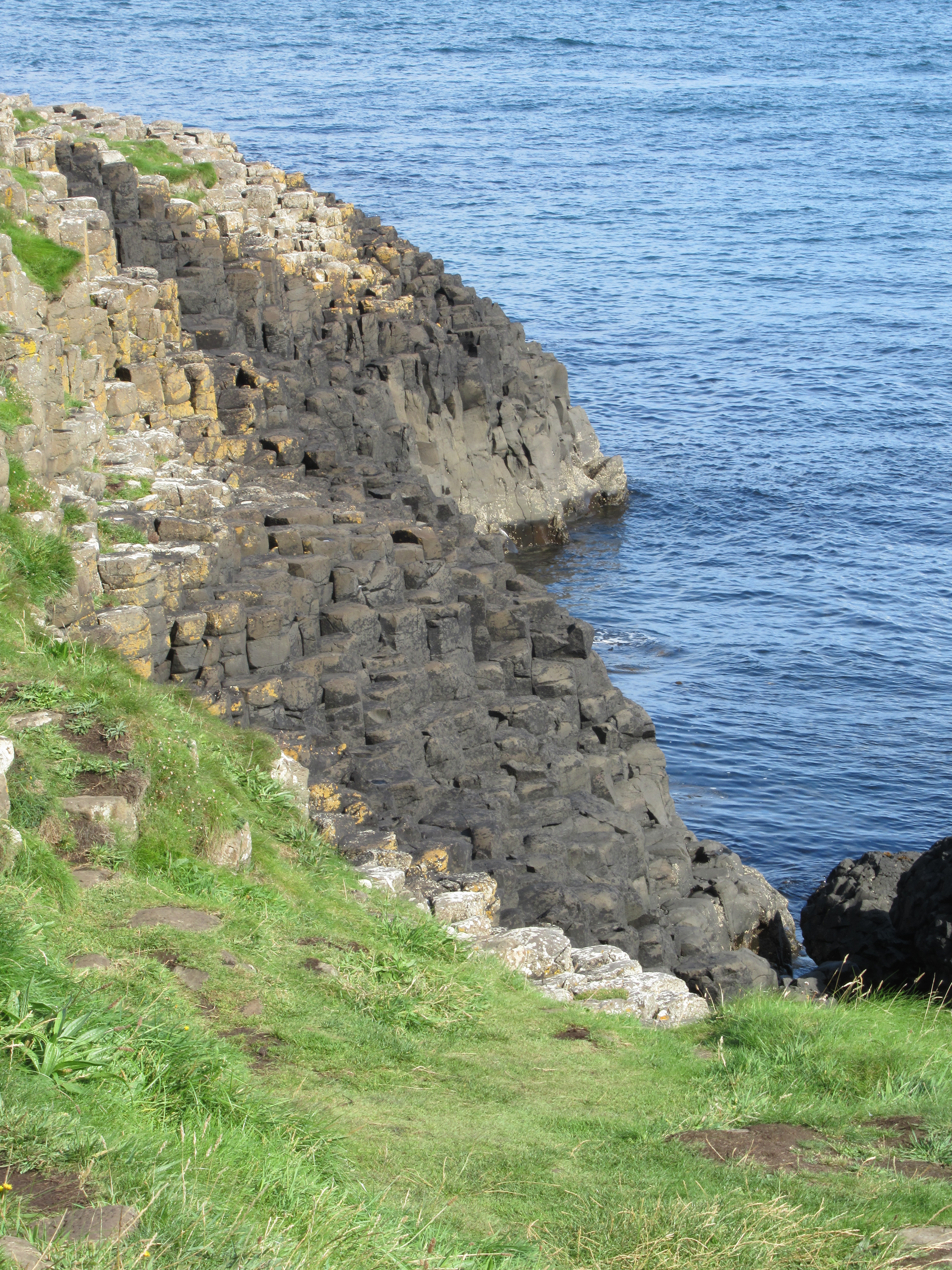 We were curious about the name, Giant’s Causeway. As is the case so often in this part of the world, there is a legend. According to the legend, an Irish giant, Fionn mac Cumhaill was challenged to a fight by the Scottish giant Bnandonner. Fionn accepted the challenge and built the causeway across the North Channel so that the two giants could meet. But, to avoid actually having to fight, Fionn’s wife, Oonagh disguised Fionn as a baby and tucked him into a cradle. When Benandonner saw the size of Fionn’s ‘baby,’ he fled back to Scotland in fright, destroying the causeway and leaving only the coastal columns.