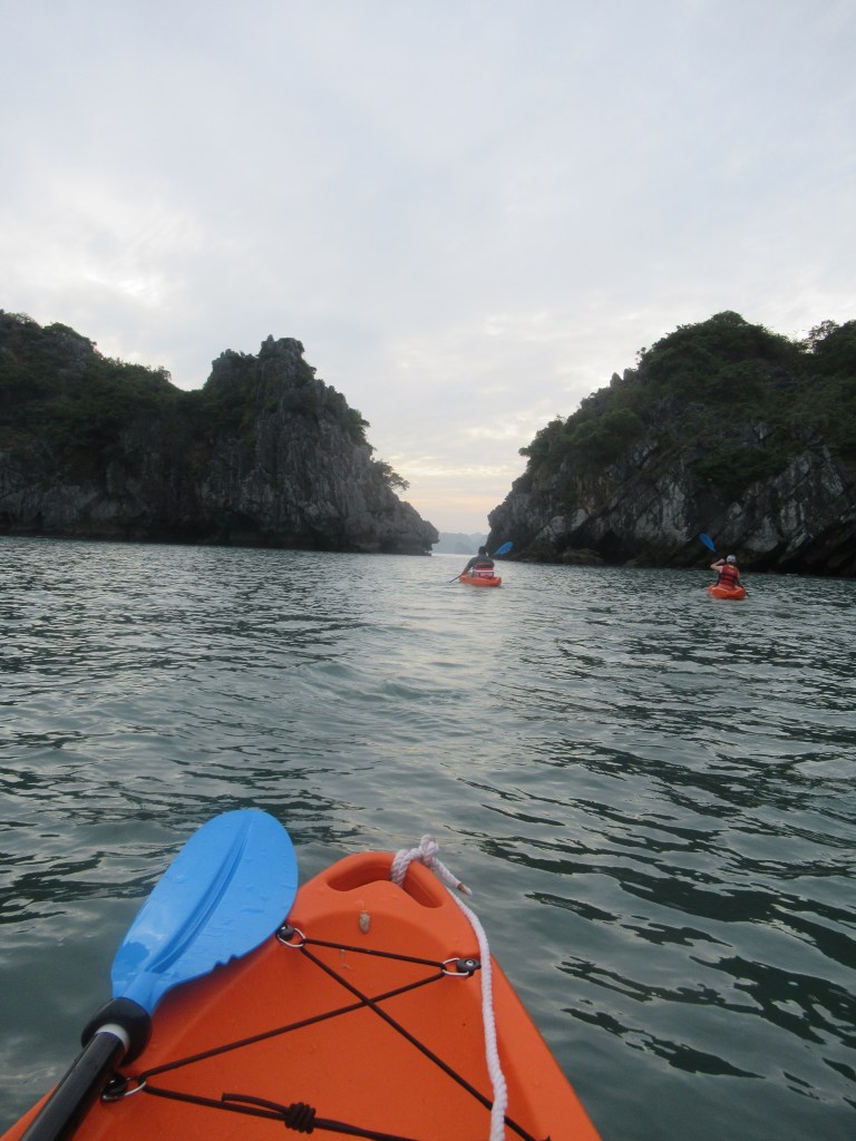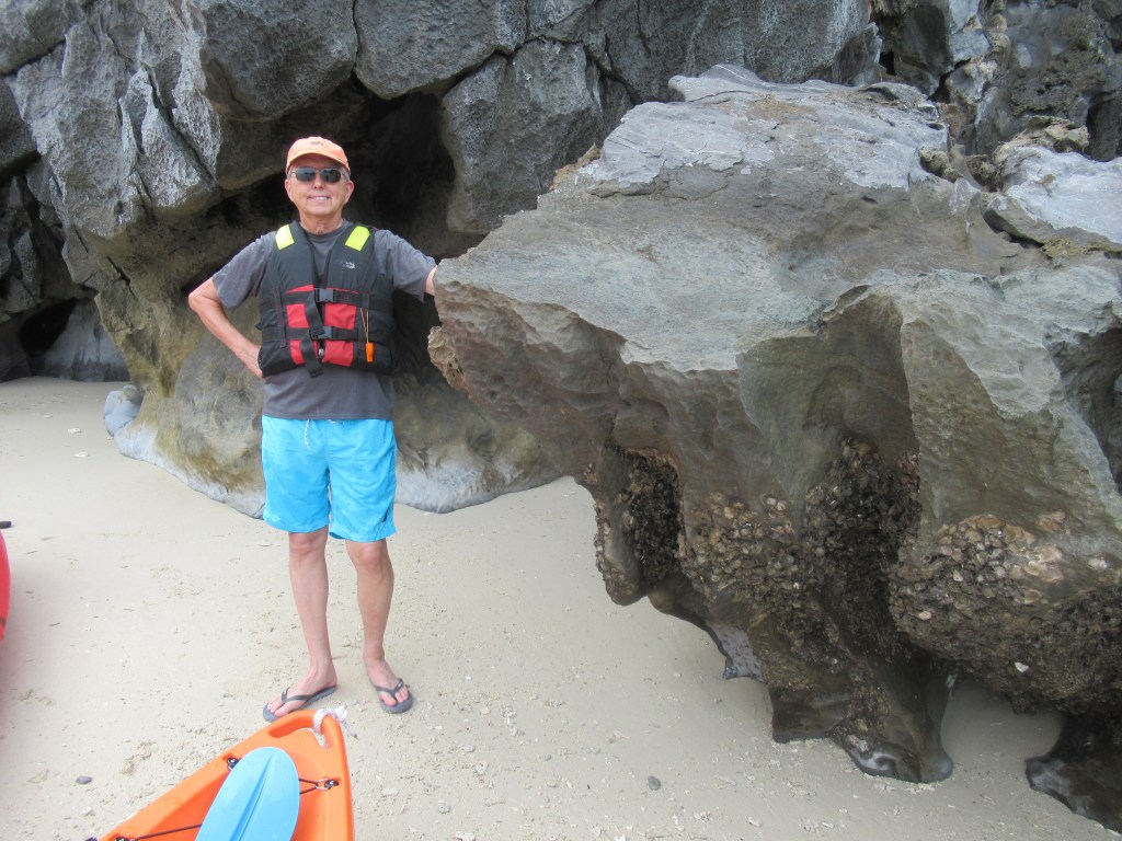 Our boat was comfortable, even though it had some age on it. Once we were on board and the cruise was underway, we were treated to a delicious multi-course meal of Vietnamese cuisine. Later in the afternoon, we took a small tender boat over to a place in the bay where kayaks were stored. We took the kayaks over to a small beach and swam for a bit, then got back in the kayaks and paddled back to the tender. Paddling in and among the karsts was beautiful and fascinating. In the evening, once we were back on our boat, we had a barbecue with various meats and seafood.