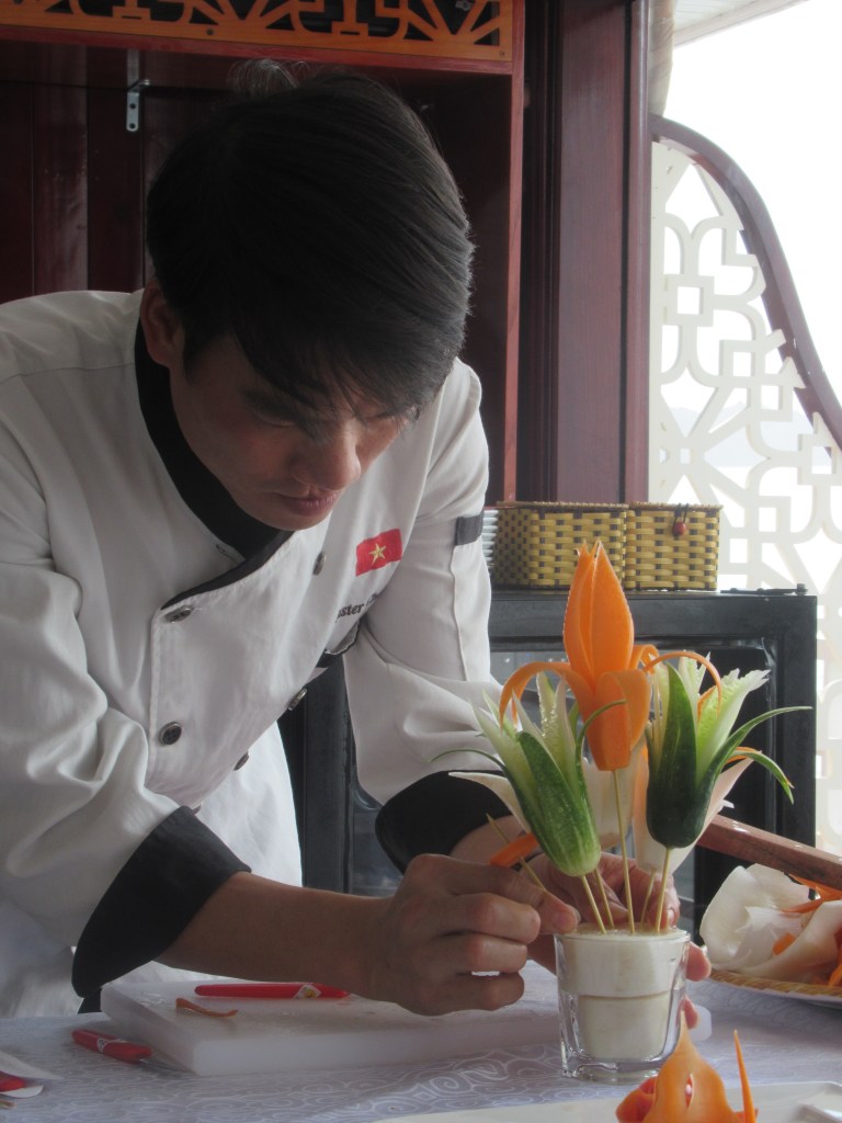 Later on, the Master Chef on board demonstrated how to create a bouquet out of carved vegetables, after which we all made (and ate) spring rolls with rice paper wrapping and vegetables. All of the cruise activities were fun, but we enjoyed cruising on the boat and enjoying the remarkable scenery best of all.
