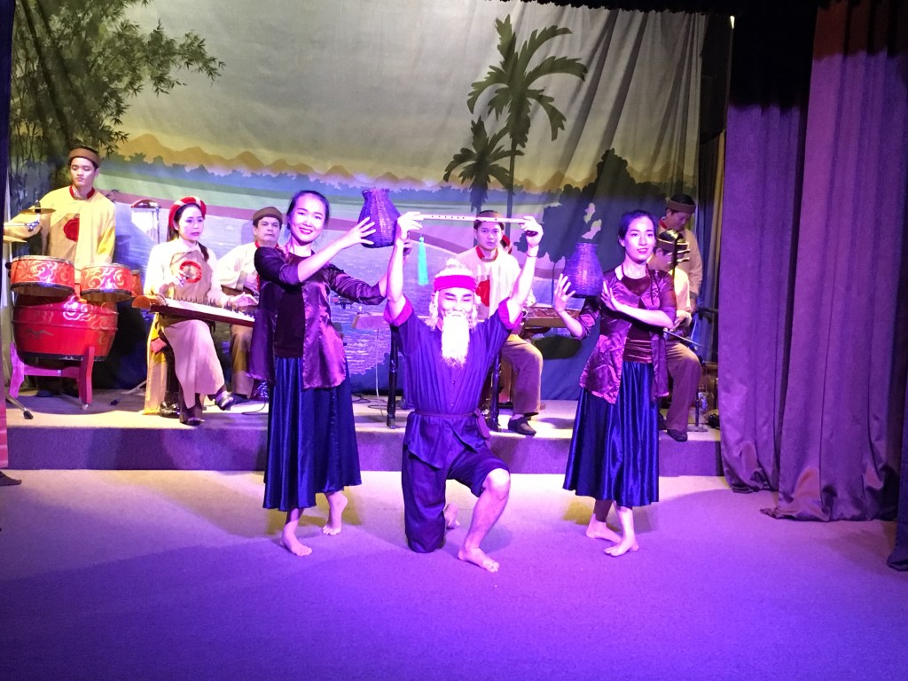 While we were in Hanoi we had heard that water puppets are a uniquely Vietnamese form of entertainment, not to be missed while in the country. I was happy to see that this is something that is offered in Hoi An. We bought tickets for the last night we were in town. I wasn’t sure what to expect, but the water puppets actually are puppet performances that take place in a small pool of water instead of on a stage. The puppeteers, like all puppeteers, are behind a screen, but these are standing in waist-deep water as they manipulate the puppets. The performance was only 45 minutes long and was made up of about a dozen short performances depicting elements of Vietnamese life and folklore. The program closed with the puppeteers coming out for a bow and, curiously, singing “Auld Lang Syne.”
