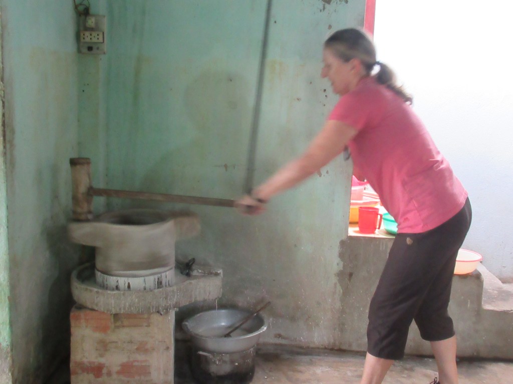 The first place we visited was a home where the couple who live there make rice paper in the traditional way. They own a small, hand-operated mill that they use to make “rice milk,” from water and rice. The rice milk is then used to make rice paper by cooking it on a hot surface. The heat comes from burning the rice husks. Nothing is wasted. We ate a few treats made from the rice paper and they were delicious!