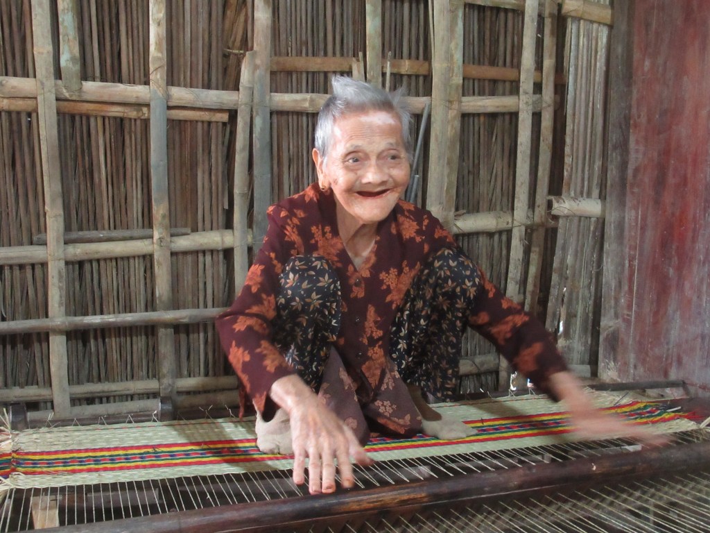 Our next stop was at the home of some folks who make sleeping mats out of reeds that grow in the water. Their house is pretty rudimentary and is a kind of an open-air affair. It doesn’t get cold here as it does in the north of the country, still, there are times when one wants the weather kept out and this house didn’t look like it could do this very well. The eldest lady in the family is 100 years old and has been making these sleeping mats since she was 5 years old — 95 years of making sleeping mats! The mats are sold to middlemen, so the people making them don’t earn a lot. Many of these sleeping mats are machine made now, in fact, the folks who make the sleeping mats sleep on a machine made one. I asked why, and Yen told me that it’s because the loom they have only makes the size mat for a single or twin size bed and they have a double. Their beds are either bamboo slats or a flat piece of wood – no pillow top mattresses!