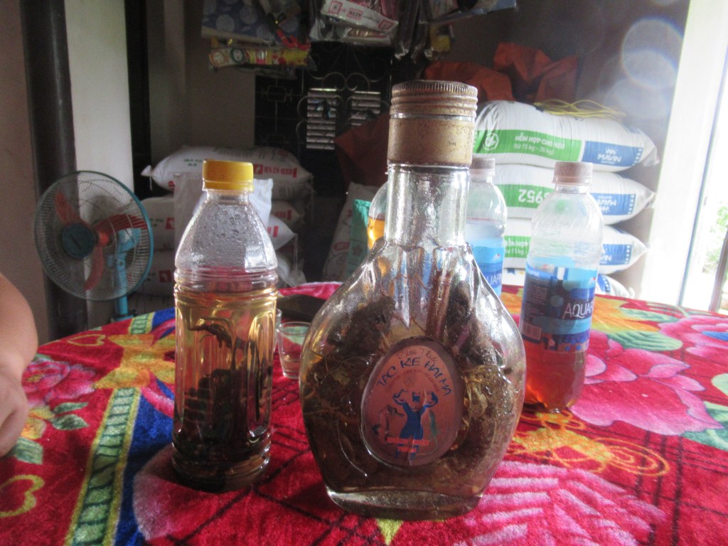 Our final stop was at the home of the man in the village who makes rice wine. Yen showed me how he uses the brown rice, then ferments it over several days. She showed me the bubbling of the fermented product in with the rice. The man is also the village healer and he has many jars of herbs and other remedies, including a bottle of rice wine with a scorpion it and another with geckos in it. These remedies are used to treat a wide variety of maladies, including infertility, and can also increase libido.