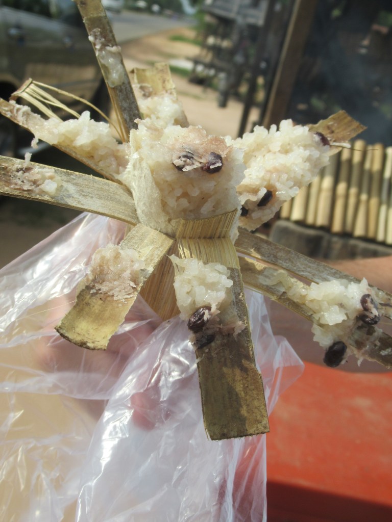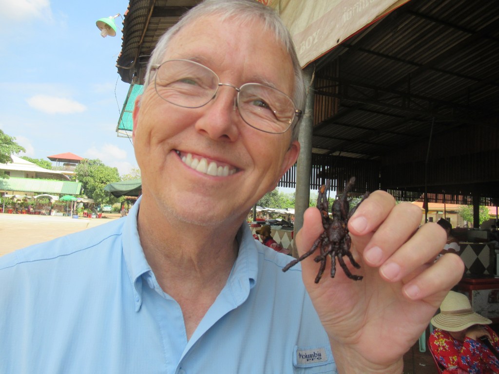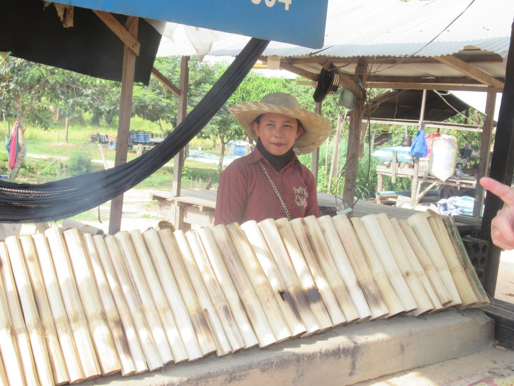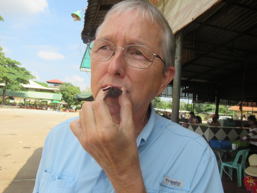 We opted to book a taxi to take us on the 5 to 6 hour drive from Phnom Penh to Siem Reap. A flight would have taken us just as long door-to-door, would have cost more, and these flights have a reputation for hitting people up for extra luggage charges at the gate. We booked the car and were picked up in a beautiful, air conditioned Lexus SUV for the ride, which turned out to be quite pleasant and on a very new road. Along the way, our driver chatted with us about life in Cambodia and also stopped at a few sites, including a market where we could buy such local delicacies as fried spider, grasshopper, and silkworms, along with a roadside stand where we could buy sticky rice and black beans that had been roasted in bamboo. John tried the fried insects and we both tasted the sticky rice.