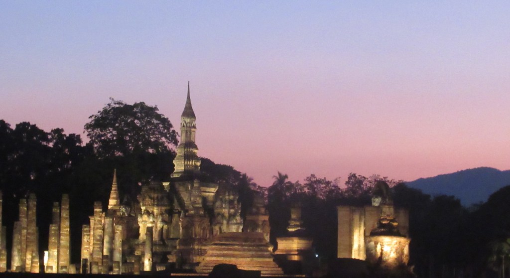 We left Ayutthaya and went on to Sukhothai, another former kingdom from the 13th century until the 15th century. There’s not a whole lot to see in the town of Sukhothai, other than the Historical Park, which holds temple ruins to rival those in Angkor Wat, being both larger and more intact than those in Ayutthaya. A must-see in Sukhothai is the excellent Ramkhamhaeng National Museum which provides quite a bit of background on the sights in the Historical Park. One welcome aspect of Sukhothai is that a fraction of the number of tourists visit it compared to Angkor Wat, a great selling point in our opinion. There’s nothing that spoils a nice “Raiders of the Lost Ark” moment like hordes of tourists tromping around taking selfies. Since the park is much more compact than Angkor Wat, most people tour it on bicycle. We got up early one morning and took a tuk-tuk down to the historical park where we rented bikes and were in the park by 7:30 a.m. We took our time, enjoying the ride and checking out the temples. We completed our self-guided tour and left at around 9:45 — just in time to see multiple tour buses drive up and disgorge huge numbers of passengers who proceeded directly to the bike rental place. We were delighted to leave before the heat and hordes of tour groups! Since we were in Sukhothai over a weekend, we were there for the weekly Saturday evening, opening of the temples. Seeing these ruins at dusk and beautifully illuminated was a magical way to end our time in Sukhothai.