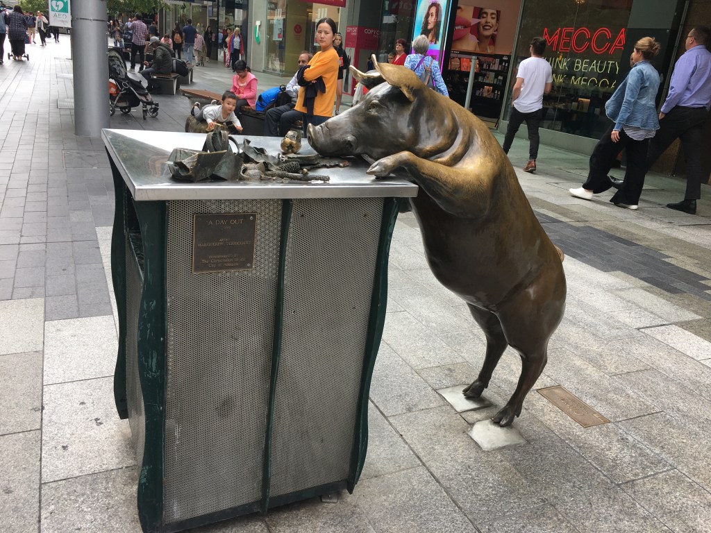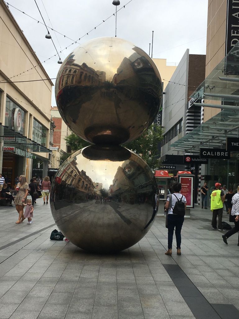 With the rental car returned, we focused on the city of Adelaide. Adelaide was designed in the 19th century as a city in a grid, surrounded by green spaces. The green spaces are still intact and include gardens, playgrounds, sports fields, and other public areas. The city’s inner grid still has many of the frontier-style heritage houses in the neighborhoods, some are still homes, while others house small businesses. There is a lovely walking mall with a funky sculpture of two metallic balls stacked one on the other called “Mall’s Balls.” There is a haunted Victorian-era mall, and a popular sculpture of brass pigs. Adelaide was abuzz with energy the week we were there, as they were hosting the bicycle race Tour Down Under and cyclists were everywhere. Adelaide doesn’t seem to compete for the limelight as much as its larger cousins, Sydney and Melbourne, in fact, one gets the idea that Adelaide is happy to be less touristy than other Australian cities. All the same, the city is home to a seemingly endless stream of festivals, so the guest cyclists in town didn’t seem to bother anyone.