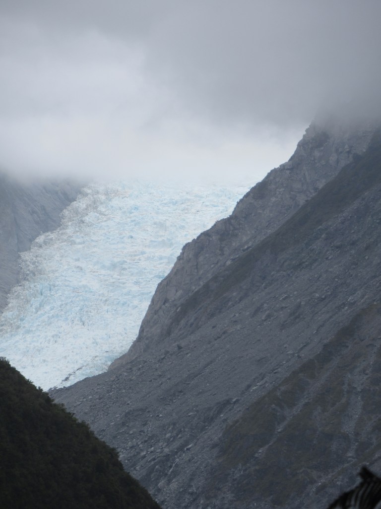 We arrived in Fox Glacier and were disappointed to realize that the low fog obscured what should have been a spectacular mountain view. In the couple of days were were there, however, we enjoyed a nice hike around Lake Matheson, a well-known “mirror lake” and also a hike up to the Fox Glacier viewpoint. Lots of people take a helicopter up to see the glacier. We weren’t planning to do that anyway, but the helicopters were grounded due to the fog.