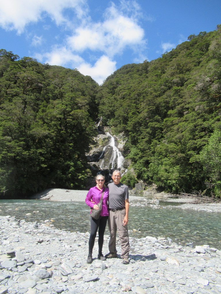 Near the end of our time in Te Anau, we went to the local movie theatre to see Ata Whenua Fjiordland on Film, which is a 35-minute documentary on Fjiordlands National Park that runs about ten times every day in Te Anau. The film has lots of aerial photography that allows much of the park to be seen that can only be seen in a helicopter ride or through this film.  As we walked into the darkened theater, I heard a voice say, “Sallie?”  I looked up and saw our friends Kim and Scott a row behind us! We had seen them in Sydney and had known that they would be moving on to New Zealand, but had thought that they we would be gone by the time we arrived. What  a treat to see them and have dinner together.