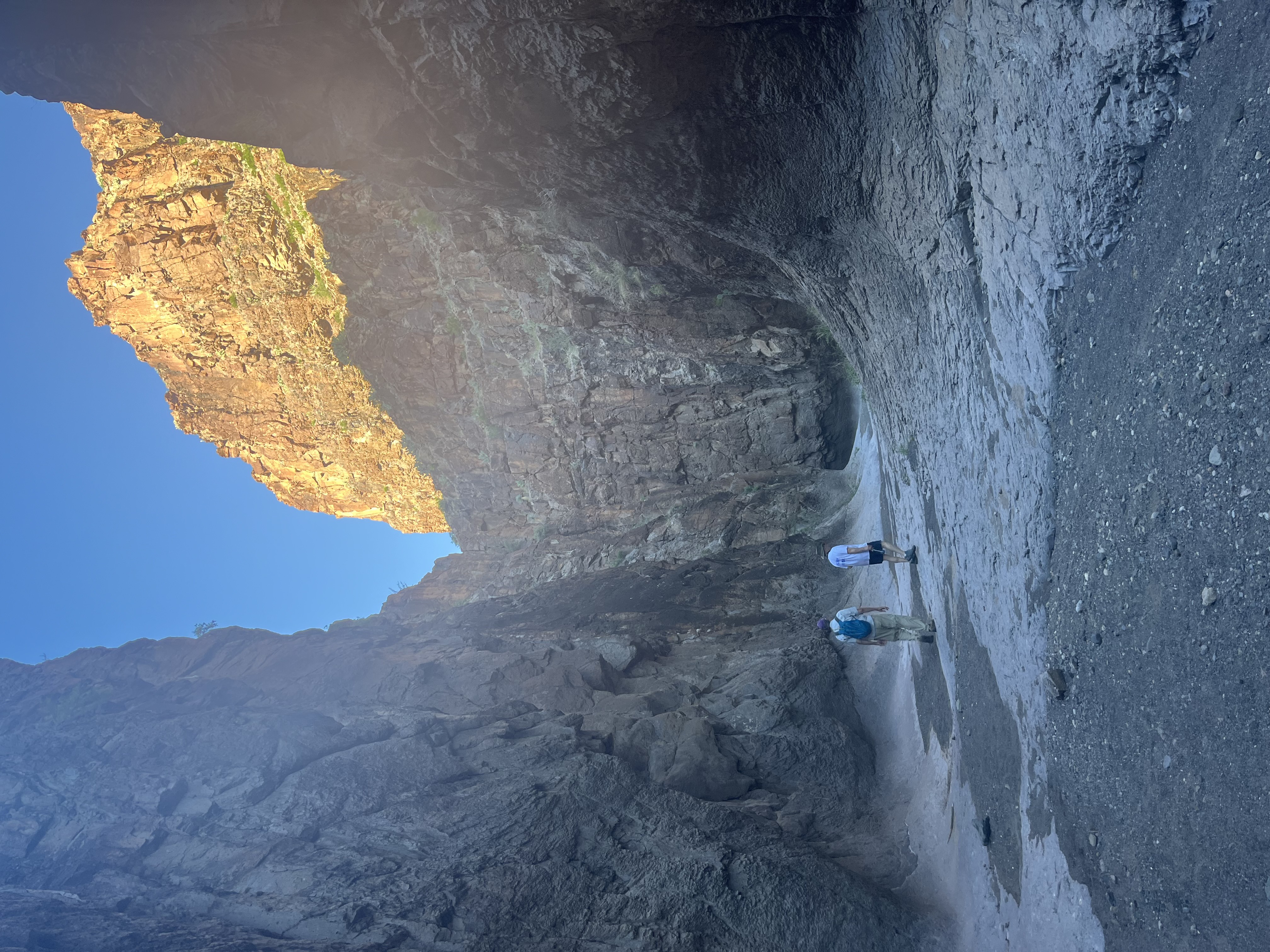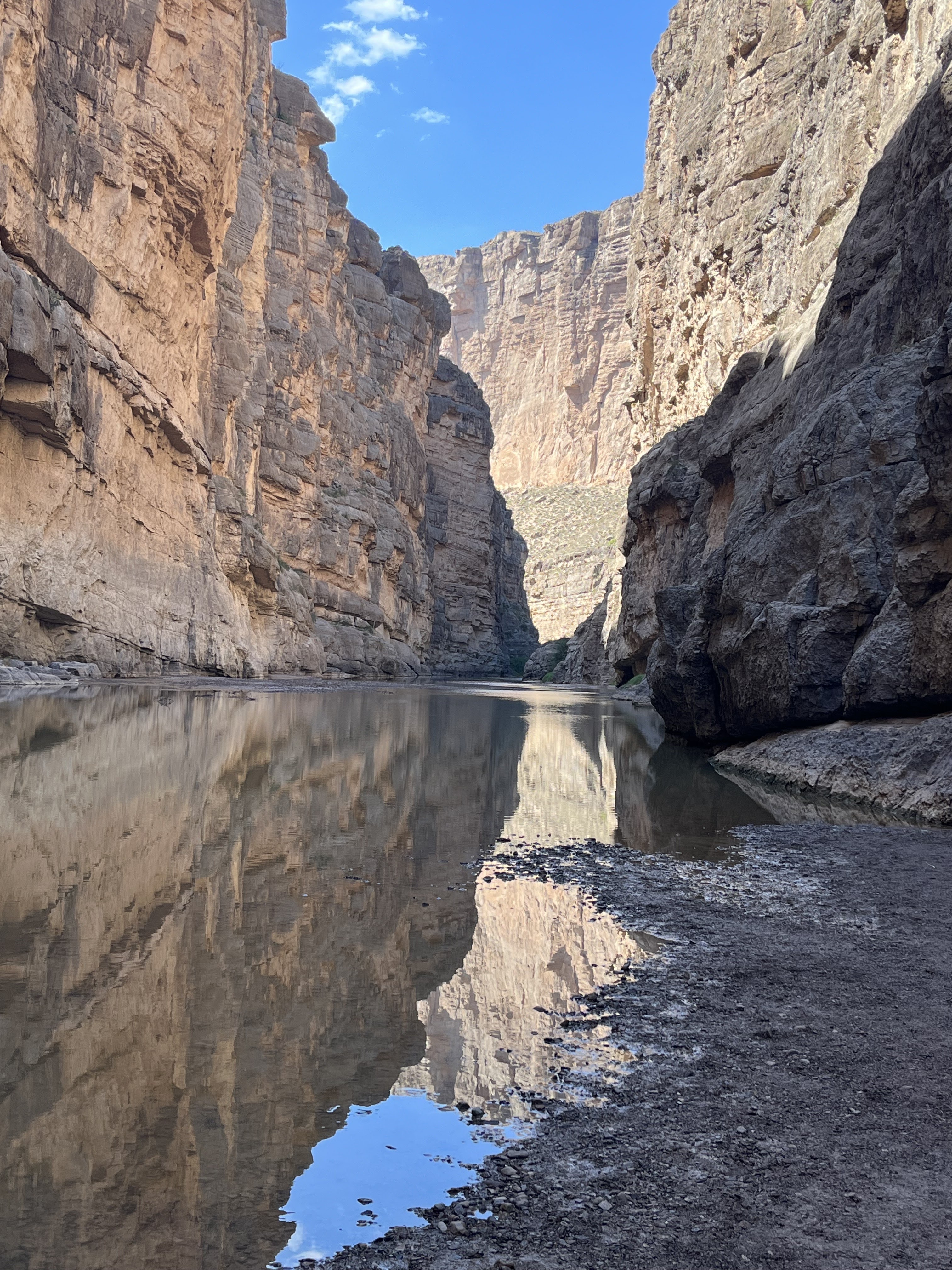Fortified by a hearty breakfast, we took the short drive to Big Bend National Park. After a quick stop at the visitor center, we took the Ross Maxwell Scenic drive, which cuts right through this huge park, making our way to Santa Elena Canyon on the Rio Grande by around noon. If we had been more thoughtful about our planning, we would have started at the Santa Elena Canyon first thing to hike it in the cool of the morning and taken the scenic drive later in our air-conditioned car. Santa Elena Canyon is a beautiful hike, nonetheless, and after the initial climb in the sun, we enjoyed refreshing shade and a the iconic view of the canyon.