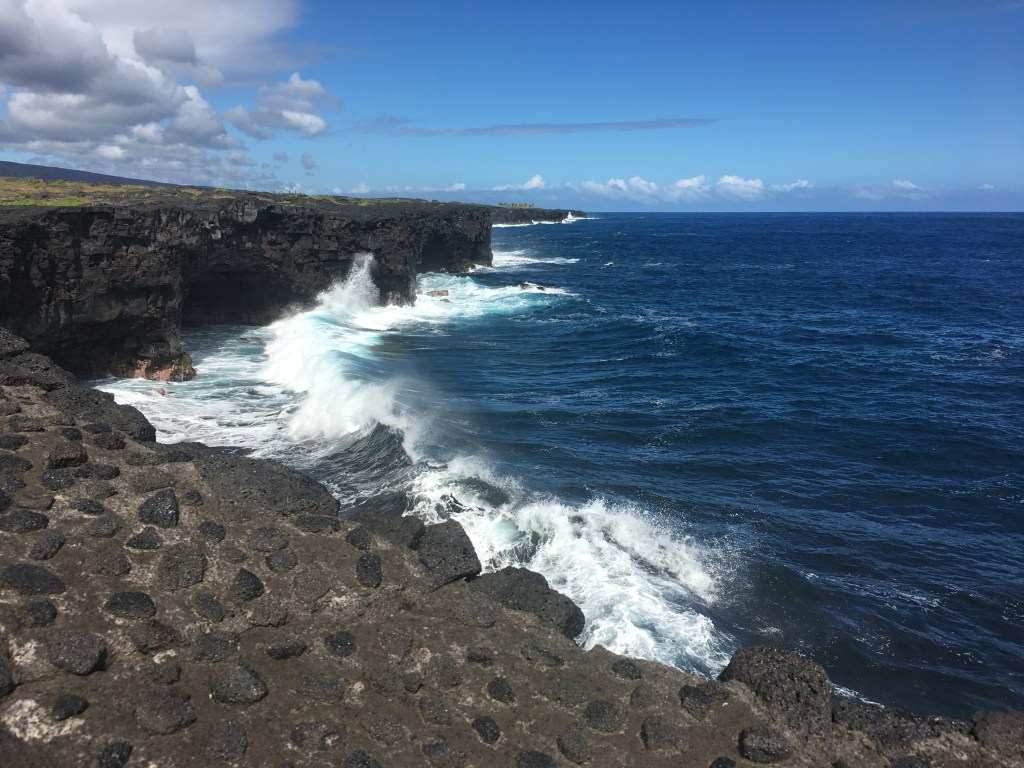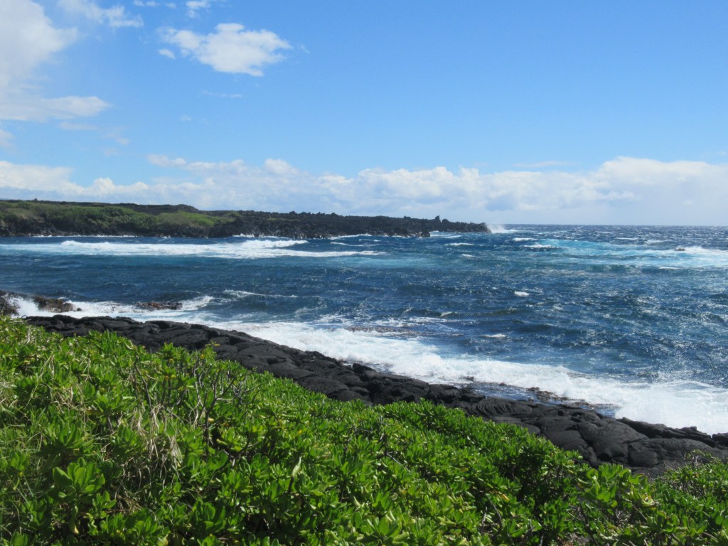 Volcanoes National Park: We’ve all seen it on the news: reports and footage of Kilauea and Mauna Loa erupting, dramatic bursts and the bright red and yellow lava flowing like a viscous river down the mountain. Although it would have been fun to see an actual lava flow, there was no volcanic activity during our visit. Nevertheless, I was unprepared for the beauty of the black lava rock in its lovely forms, draping the landscape, covering roads, and showing no respect for anything manmade, showing us, once again, that Mother Nature is always the boss. We resisted the urge to slip a piece of volcanic rock in our pocket, lest we suffer the curse of Pele, the Hawaiian goddess of fire and volcanoes. This would have brought on months, or even years, of bad luck. But seriously, it’s illegal, and just plain bad manners to remove rocks or minerals from any national park.
